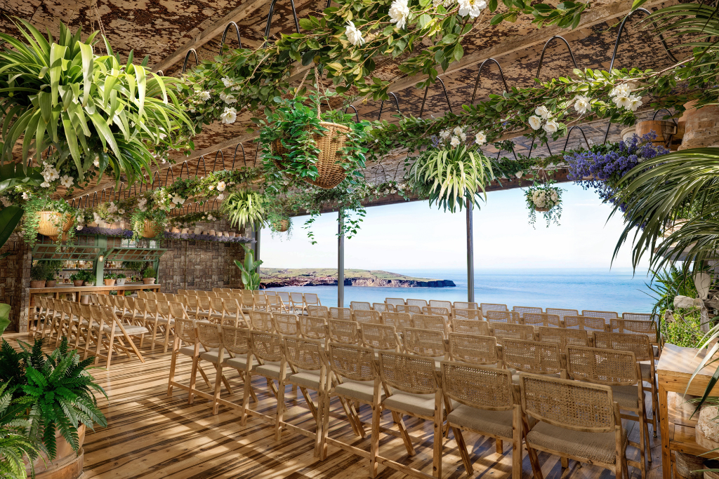 A barn-conversion retreat designed for laid-back celebrations. Think mismatched furniture, Mediterranean courtyards, fire pits, live music stages, and wood-fired kitchens – perfect for couples seeking an effortless, eclectic vibe with breathtaking sea views.